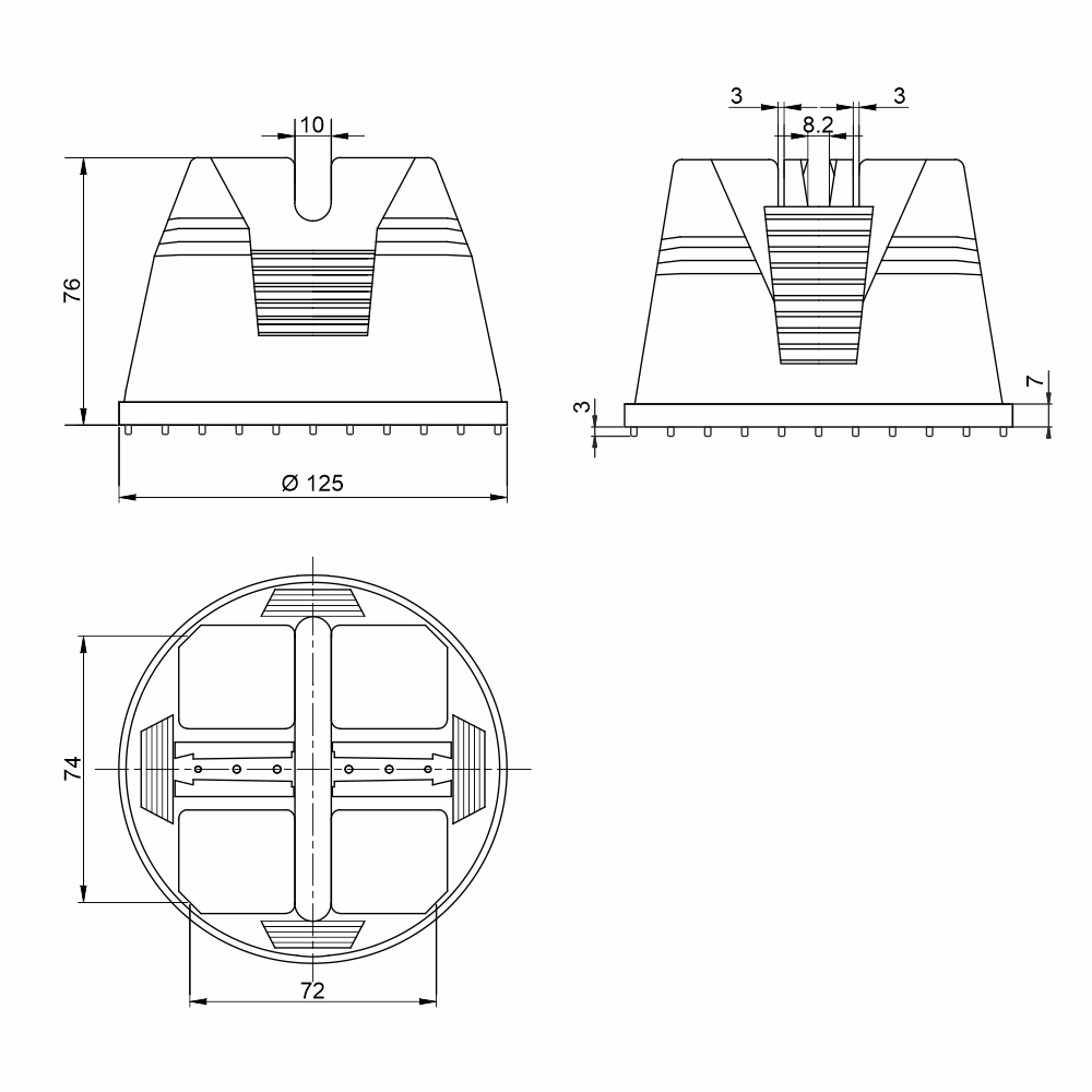 Держатель выполнен из пластика и используется для фиксации проводника (прутка) диаметром 8 либо 10 мм на плоских кровлях. Внутренняя полость держателя заполнена бетоном. Конструкция изделия имеет систему выступов высотой 3 мм для надежной фиксации на плоскости кровли. Для крепления изделия возможно применение клеевых составов (жидкие гвозди и т.п.). Предназначен для фиксации токоотвода на плоской кровле путём приклеивания на битумную ленту. Держатель не применяется для мембранных кровель.