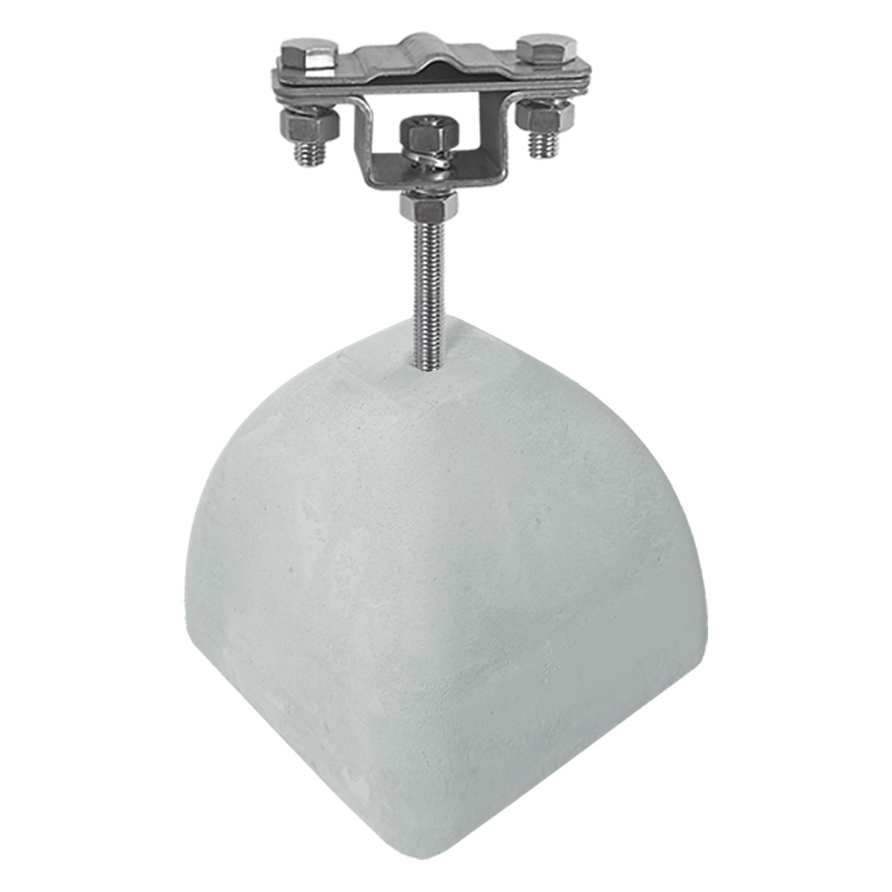 Держатель-зажим применяется для закрепления прутка и полосы молниезащитной сетки на плоских кровлях. Изделие выполнено на основе бетонного утяжелителя массой 2 кг. Проводники надежно закрепляются на кровле под собственным весом утяжелителя. В состав изделия входит зажим из оцинкованной стали для соединения прутка диаметром 8-10 мм с полосой шириной до 40 мм.