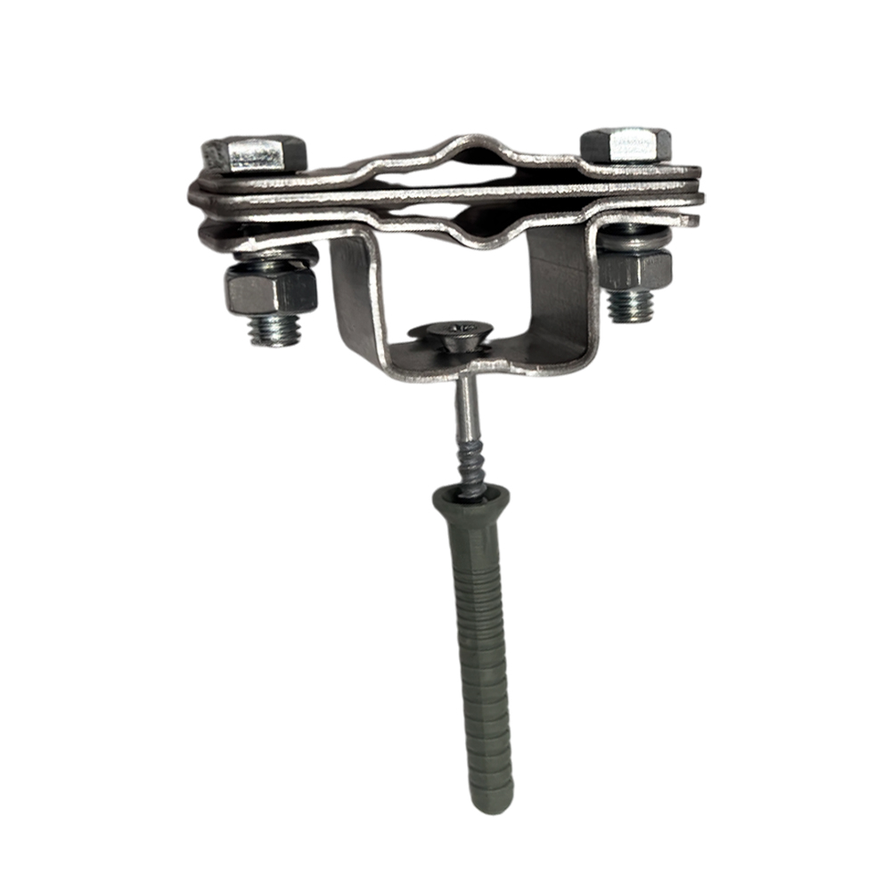 Зажим стягивается болтами с гайками М8. Для крепления держатель имеет дюбель-гвоздь.