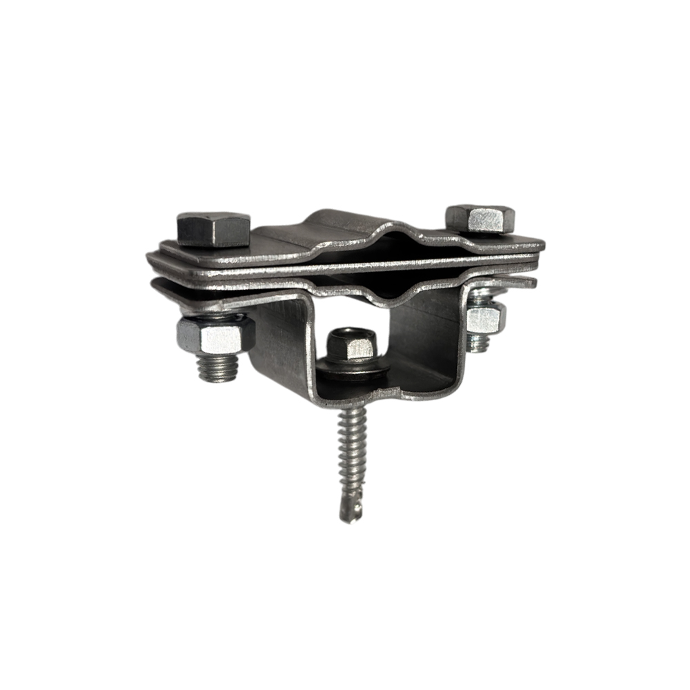 Зажим стягивается болтами с гайками М8. Для крепления держатель имеет отверстие диаметром 8,4 мм под винт либо саморез. Держатель закрепляется на кровлю.