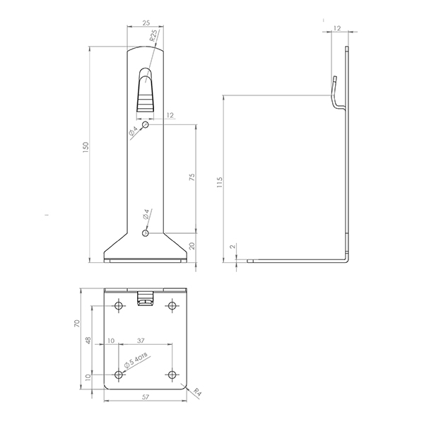 Держатель имеет Г-образную конфигурацию. Выполнен из листовой оцинкованной стали толщиной 2 мм и используется для фиксации прутка молниезащитной сетки диаметром 6-10 мм на вертикальной, горизонтальной или наклонной плоской поверхности в специальном пазу, обеспечивая расстояние 65 мм от прутка до плоскости. Для крепления имеются отверстия диаметром 5 мм под саморез.