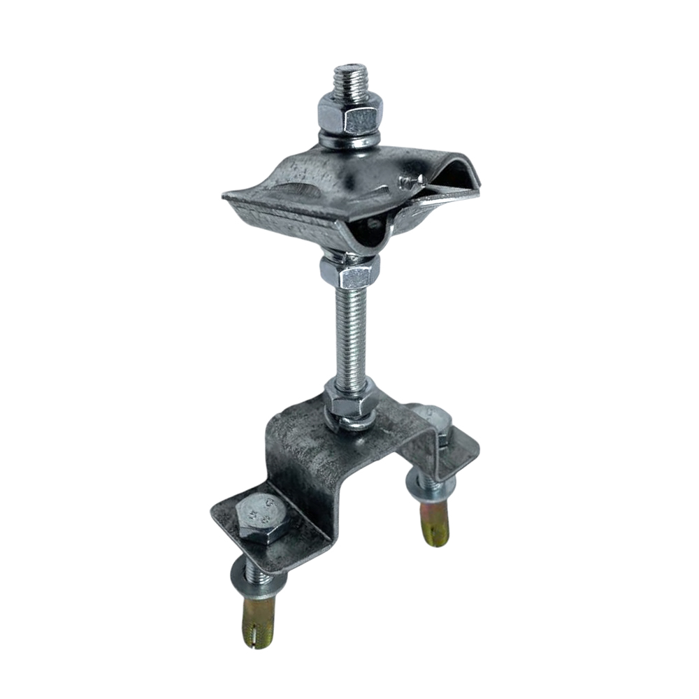 Держатель-зажим выполнен на основе зажима соединительного круглого проводника из оцинкованной стали, закрепленного на шпильке со скобой и дополненного анкерными болтами 8х60.