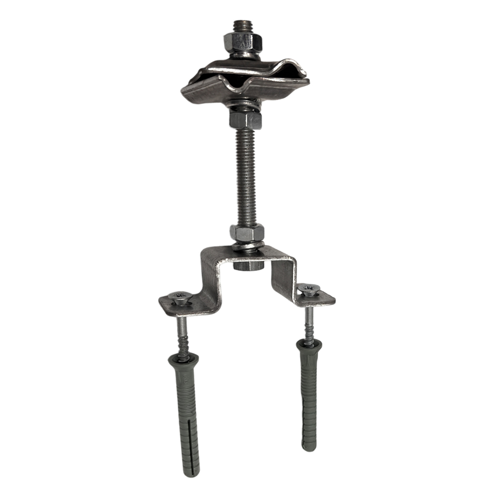 Держатель-зажим выполнен на основе зажима соединительного круглого проводника из оцинкованной стали, закрепленного на шпильке со скобой и дополненного анкером забивным M8.