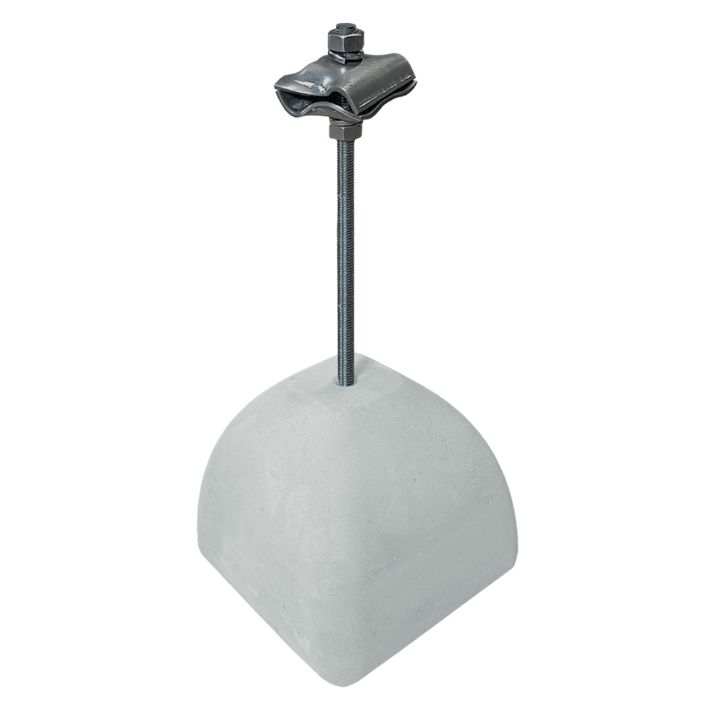 Держатель-зажим применяется для закрепления прутков молниезащитной сетки диаметром 8-10 мм на плоских кровлях. Изделие выполнено на основе бетонного утяжелителя массой 2 кг. Проводники надежно закрепляются на кровле под собственным весом утяжелителя. В состав изделия входит зажим из оцинкованной стали для соединения прутка в перпендикулярном направлении, в параллельном направлении, а также под произвольным углом с помощью болтового соединения. Для крепления изделия возможно применение клеевых составов (жидкие гвозди и т.п.).
