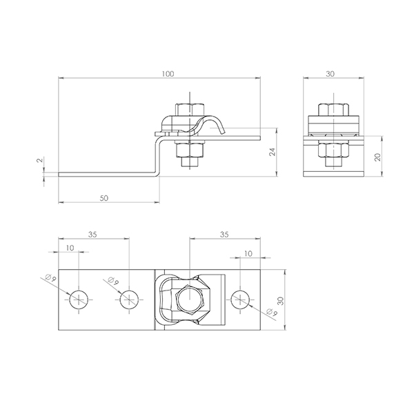 Для крепления на плоскости пластина держателя-зажима имеет два отверстия диаметром 8,4 мм.