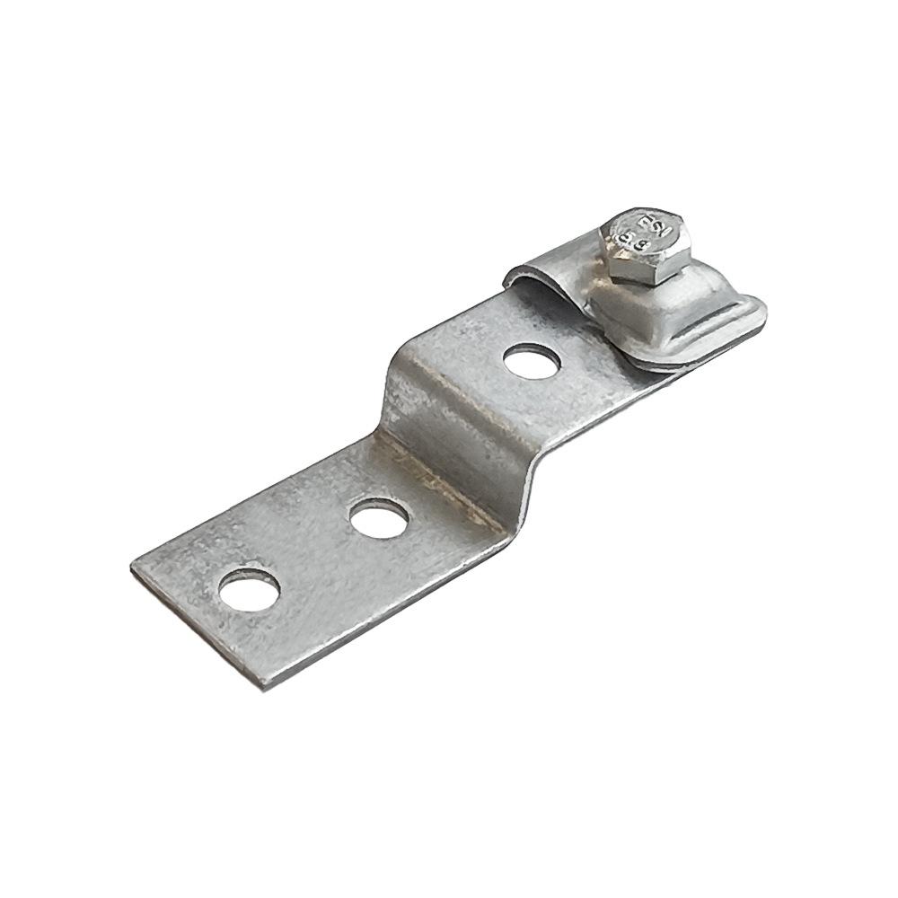 Держатель-зажим выполнен на основе зажима соединительного круглого проводника, закрепленного на Г-образной пластине и применяется для закрепления прутка 6-10 мм к металлическим конструкциям (фермам, ограждениям, лестницам), а так же позволяет закреплять пруток 8-10 мм на фасаде, либо кровле.