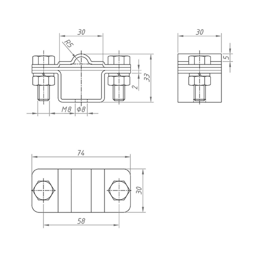 Зажим стягивается болтами с гайками М8. Для крепления держатель имеет отверстие диаметром 8,4 мм под винт либо саморез.