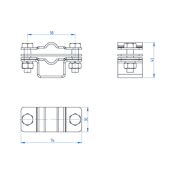 Зажим стягивается болтами с гайками М8. Для крепления держатель имеет отверстие диаметром 8,4 мм под винт либо саморез.