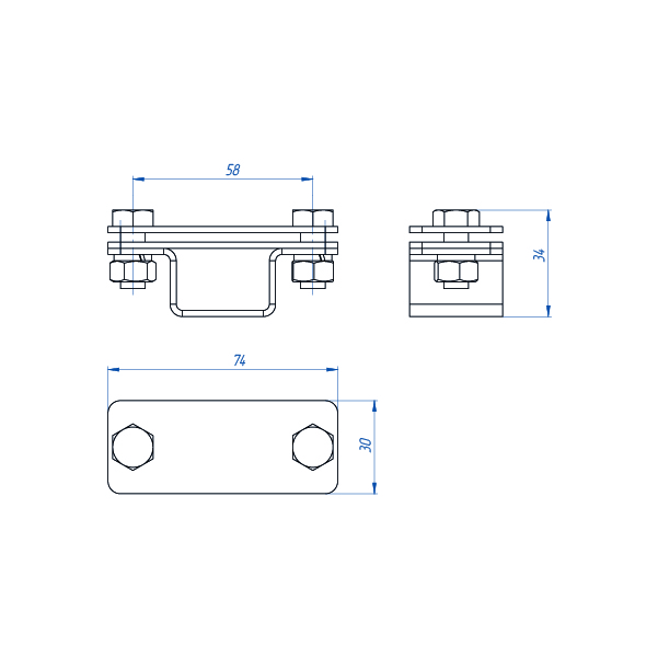 Держатель выполнен из оцинкованной стали и позволяет закрепить полосу шириной до 40 мм на горизонтальных и вертикальных поверхностях. Зажим стягивается болтами с гайками М8. Для крепления держатель имеет отверстие диаметром 8,4 мм под винт либо саморез.
