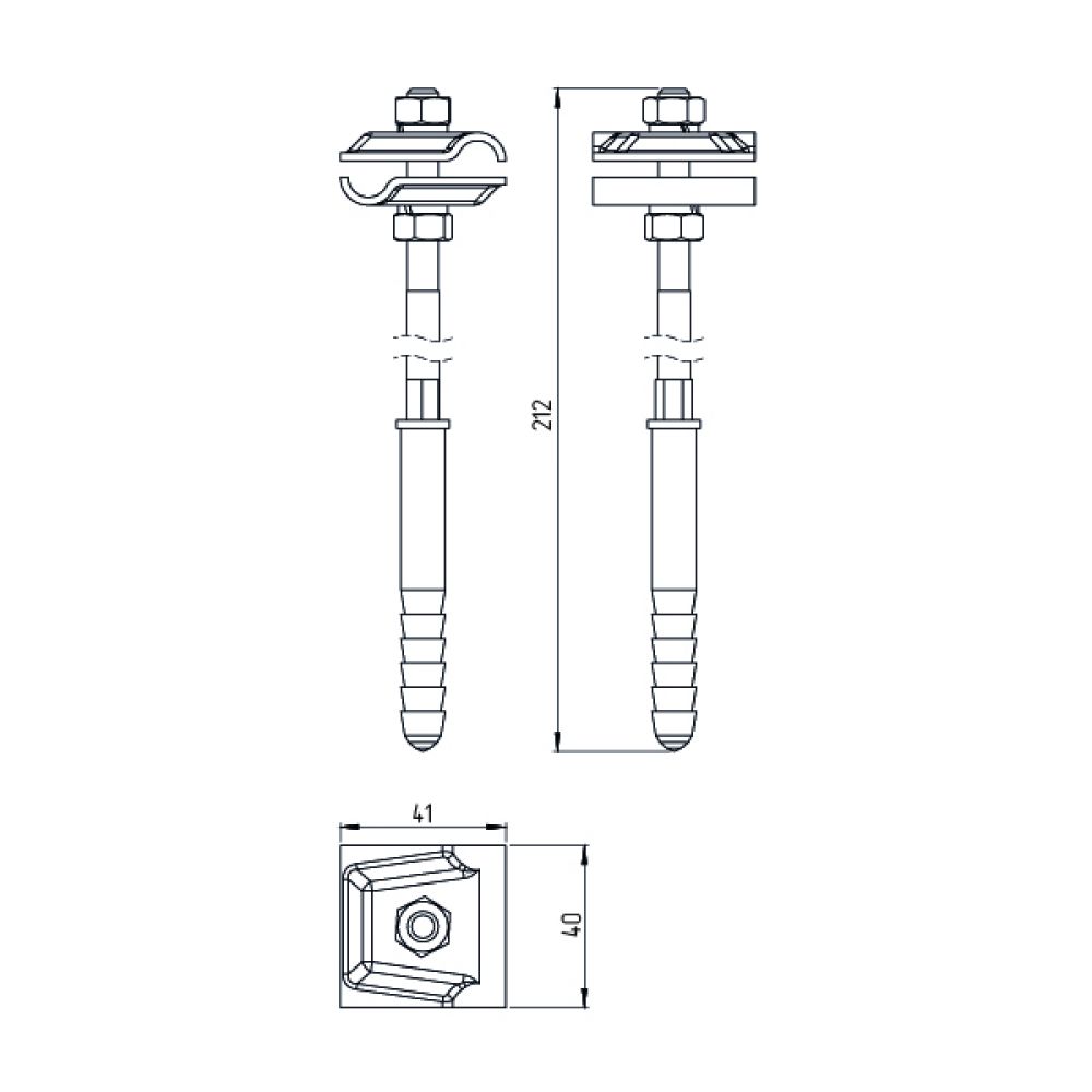 Держатель-зажим выполнен на основе зажима соединительного круглого проводника, закрепленного на шпильке для бетонного, либо деревянного фасада. Держатель-зажим позволяет закреплять пруток молниезащитной сетки диаметром 8-10 мм на фасаде, а также выполнять соединение прутков под прямым углом, произвольным углом, либо в параллельном направлении. Держатель-зажим стягивается шпилькой с гайками М8 с дюбелем по бетону и позволяет зафиксировать пруток на расстоянии 120 мм от фасада.