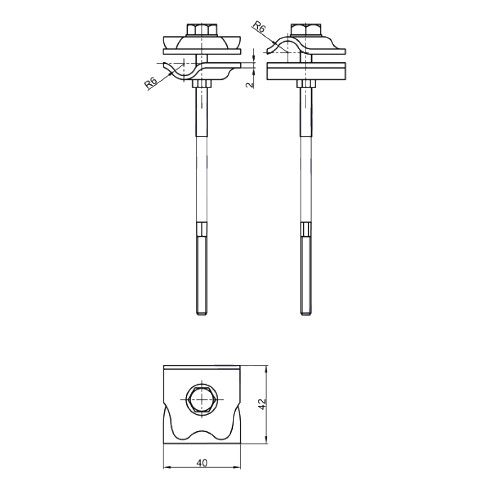 Держатель-зажим выполнен на основе зажима соединительного круглого проводника, закрепленного на шпильке для бетонного, либо деревянного фасада. Держатель-зажим позволяет закреплять пруток молниезащитной сетки диаметром 8-10 мм на фасаде, а также выполнять соединение прутков под прямым углом, произвольным углом, либо в параллельном направлении. Держатель-зажим стягивается шпилькой с гайками М8 с резьбой по дереву и позволяет зафиксировать пруток на расстоянии 120 мм от фасада.
