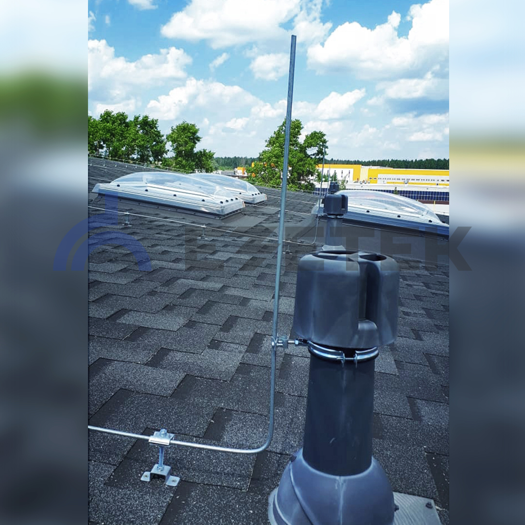 Держатель-зажим выполнен на основе зажима соединительного круглого проводника из оцинкованной стали, закрепленного на шпильке со скобой. Изделие позволяет закреплять пруток диаметром 8-12 мм на фасаде, либо кровле, а также выполнять соединение прутков диаметром 8-12 мм под прямым углом, произвольным углом, либо в параллельном направлении. Для крепления на плоскости скоба держателя-зажима имеет два отверстия диаметром 8,4 мм. Изделие стягивается шпилькой с гайками М8 и позволяет зафиксировать пруток на расстоянии от 25 мм до 100 мм до плоскости установки.