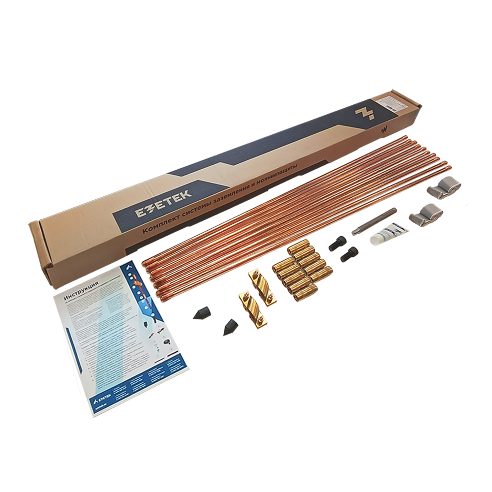 Комплект заземления EZ – 15 предназначен для монтажа на глубину 7,5 метров в 2 очага. Суммарная длина вертикального заземлителя составляет 15 метров. Комплект включает в себя 10 стальных омедненных стержней длиной по 1,5 м и диаметром 14 мм вместе с необходимыми комплектующими. В их числе латунные соединительные муфты, латунные диагональные зажимы, стальные удароприемные головки, стальные наконечники, токопроводящая паста, лента для герметизации и насадка для перфоратора SDS-max. В результате при монтаже формируются два (или более) вертикальных электрода длиной по 7,5 метра.