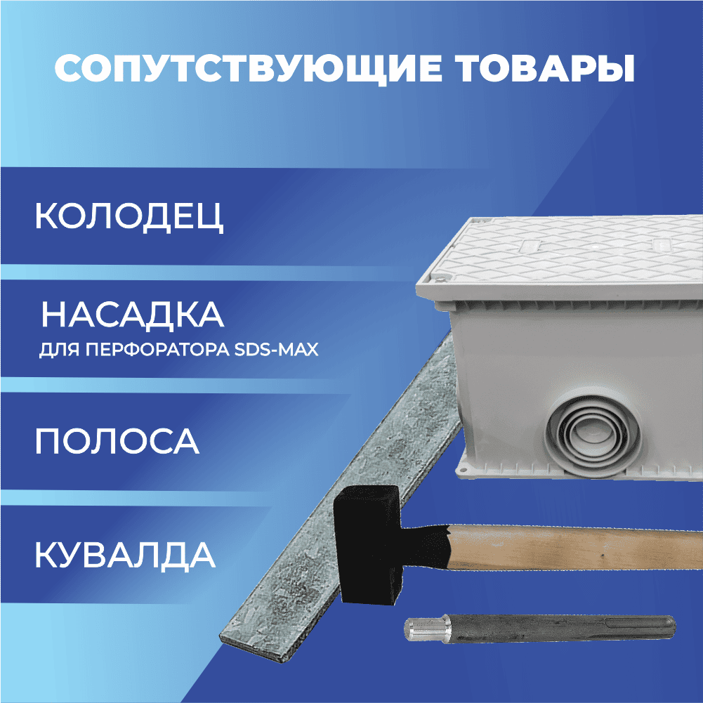 Модульно-штыревая конструкция монтируется на минимальной площади путем последовательного соединения и заглубления стержней. Установку заземления с помощью перфоратора или кувалды может самостоятельно произвести один человек. Насадка для перфоратора SDS-max , паста токопроводящая не входят в данный комплект, но вы можете купить комплект заземления с насадкой или при необходимости приобрести ее дополнительно. Контур заземления формируется при помощи горизонтального плоского проводника. В качестве проводника рекомендуется использовать оцинкованную полосу. Выбрать плоский проводник и заказать его в необходимом количестве вы можете в нашем интернет-магазине.