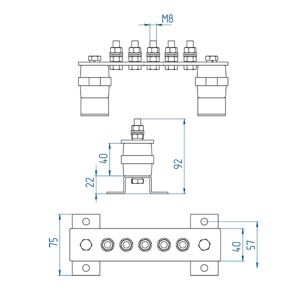 Арт. 40682. ГЗШ 5 подключений 190х40х4 мм на П-образных пластинах, медь Главная заземляющая шина выполнена из меди, имеет габариты 40х4 мм, закрепляется на пластиковых изоляторах на П-образных пластинах. Главная заземляющая шина объединяет нул...