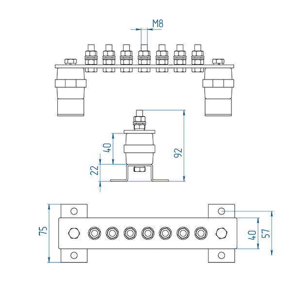 Главная заземляющая шина выполнена из меди, имеет габариты 40х4 мм, закрепляется на пластиковых изоляторах на П-образных пластинах. Главная заземляющая шина объединяет нулевые защитные и нулевые рабочие совмещенные проводники питающей линии; выводы контура заземления; заземляющие проводники; проводники системы уравнивания потенциалов. Для присоединения проводников используются болты и гайки из нержавеющей стали. Главная заземляющая шина рассчитана на максимальный длительный ток 630 А.