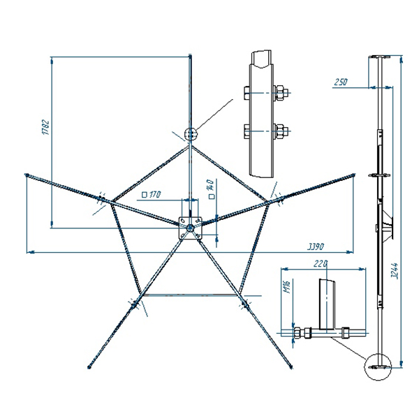 Универсальный фланец комплектуется опорой под мачту соответствующего диаметра. При заказе пятиноги без мачты по умолчанию комплектуется опорой 60 диаметра.
