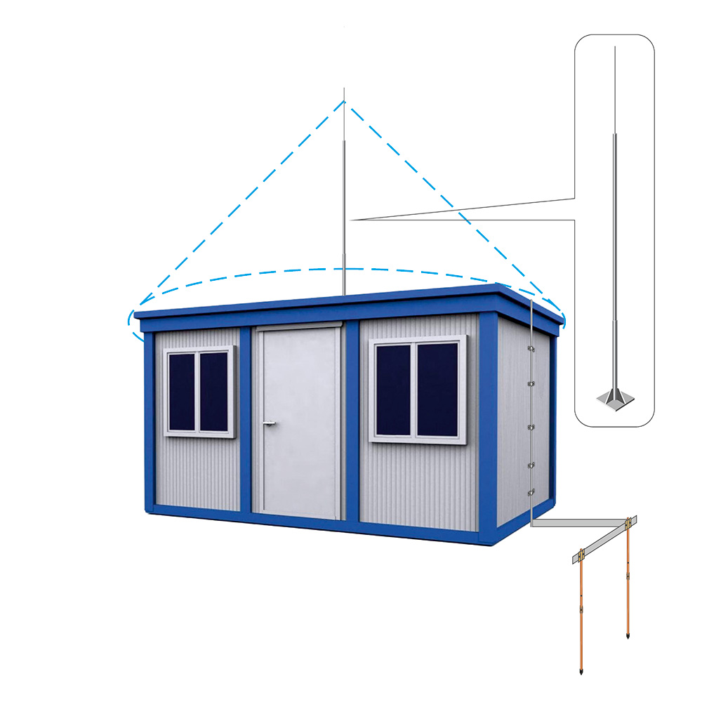 Готовый комплект 1ВК предназначен для монтажа системы молниезащиты вагончика-бытовки. Молниезащита осуществляется за счет создания зоны защиты с помощью одиночного стержневого молниеприемника. Молниеприемник устанавливается на кровле вагончика и соединяется с заземлением через проложенный по кровле и фасаду токоотвод. Заземление отводит токи молнии от системы молниезащиты в грунт. Элементы молниезащиты выполнены из оцинкованной стали, а вертикальные заземлители – из стали с омедненным покрытием. Благодаря специальному покрытию проводники надежно защищены от коррозии в течение всего срока службы.