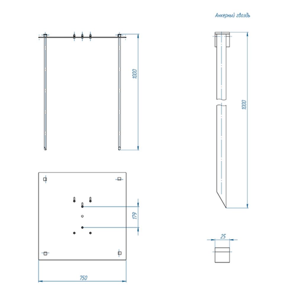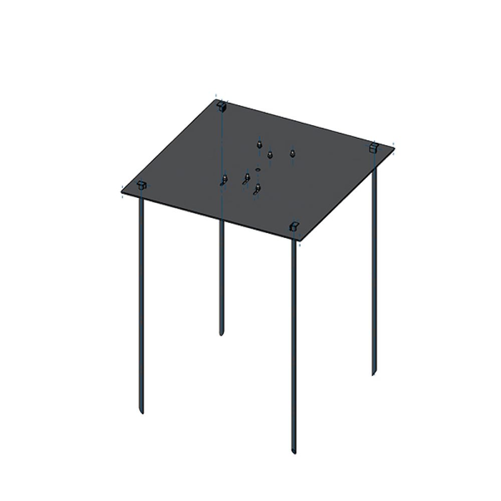 Грунтовой подпятник выполнен в виде плиты и применяется для крепления телескопических мачт серии СМТ высотой от 11 до 16 метров на грунте. Плита крепится на грунте при помощи четырех шкворней длиной один метр. На плите предусмотрено крепление при помощи болтов для подпятника мачты СМТ.