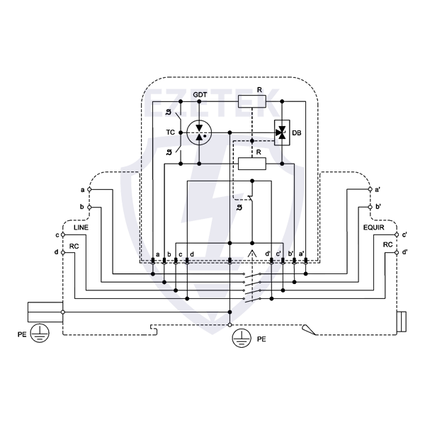 RZC — УЗИП с возможностью подключения дистанционной сигнализации для удаленного контроля за работоспособностью, выполненный на базе газоразрядной трубки с терморасцепителями и диодного моста, для защиты оборудования автоматизации, телемеханизации, связи и передачи данных. Устройство устанавливается вблизи защищаемого оборудования и предназначено для защиты от импульсных перенапряжений конечных потребителей по одной паре проводников.
