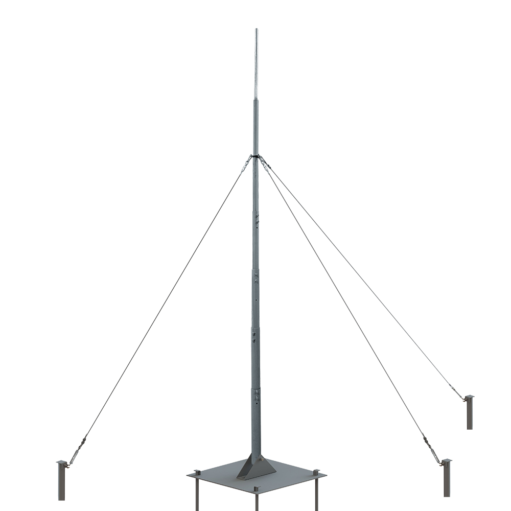 Мачта телескопическая монтируется как на плоской, так и на скатной поверхности. В комплект для крыши входит мачта телескопическая, комплект растяжек и подпятник коробчатого типа для монтажа на твердой поверхности.