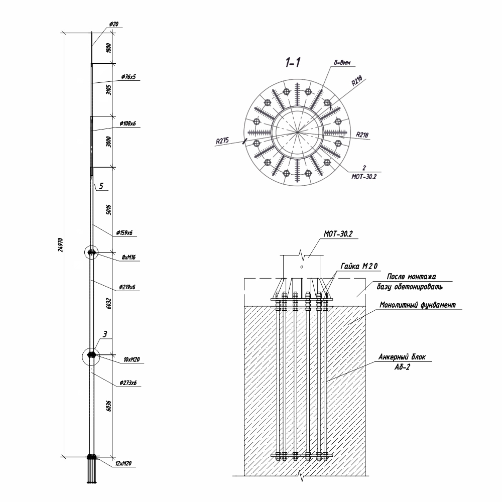 Молниеотвод МОТ-25 служит для перехвата удара молнии и отвода ее тока в землю. Он изготовлен из прочной стали и собирается из отдельных секций из труб различного диаметра и секции из круглого профиля в качестве молниеприемника. Верхние секции молниеотвода стыкуются между собой и закрепляются при помощи косынок на сварке. Нижние секции соединяются с помощью фланцев на болтах М20 с гайками. Фиксация опоры выполняется на закладной фундамент посредством соединения c закладной деталью фундамента через фланец нижней секции. Закладная деталь фундамента входит в состав молниеотвода.