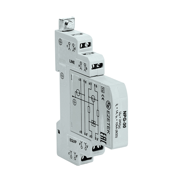 NPG — УЗИП с возможностью подключения «сигнальной» земли, выполненный на базе газоразрядных трубок с терморасцепителями и диодного моста, для защиты оборудования автоматизации, телемеханизации, связи и передачи данных. Устройство устанавливается вблизи защищаемого оборудования и предназначено для защиты от импульсных перенапряжений конечных потребителей по одной паре проводников.
