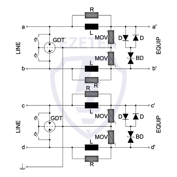 Эффективные УЗИП, содержащие каскады как грубой, так и тонкой защиты, обеспечивают продольную и поперечную защиту от перенапряжений. Первая ступень защиты состоит из трехполюсного газоразрядника (GDT) и предназначена для отвода основной энергии перенапряжения. Последующий этап тонкой защиты осуществляется с помощью быстрых двунаправленных кремниевых лавинных диодов. Последовательно включенные сопротивления обеспечивают энергетическую координацию между каскадами защиты во всём диапазоне перенапряжений. Для защиты от поражения электрическим током и пожара, которые часто возникают при контакте между линиями электропередачи и связи, в первом каскаде применена термозащита для отвода аварийного тока на землю.