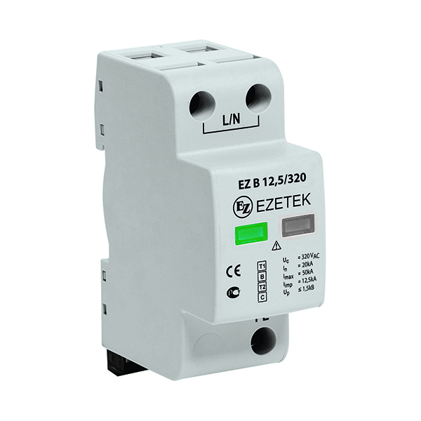 УЗИП EZ B 12,5/320 (1+0) – однополюсное устройство защиты от импульсных перенапряжений класса испытаний I+II по ГОСТ IEC 61643-11, выполненное на базе варистора. Устройство предназначено для установки в сетях с номинальным напряжением 230 В и максимальным длительным напряжением 320 В, способно выдерживать импульсные токи формы 10/350 мкс до 12,5 кА, формы 8/20 – до 50 кА. Применяется в сетях с системами заземления типа TN-S, TN-C, TT.