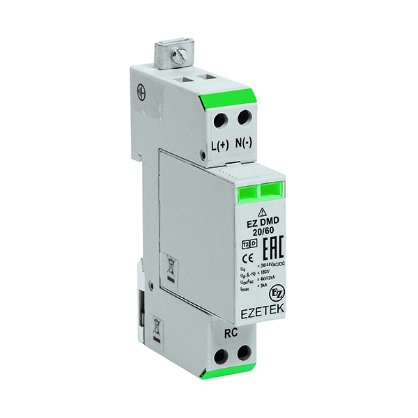 EZ DMD 20 — УЗИП III класса, выполненный на базе варисторов и газоразрядной трубки, для защиты оборудования постоянного тока от импульсных перенапряжений. Устанавливается непосредственно вблизи защищаемого оборудования и предназначен для защиты конечных потребителей от остаточных бросков импульсных перенапряжений.