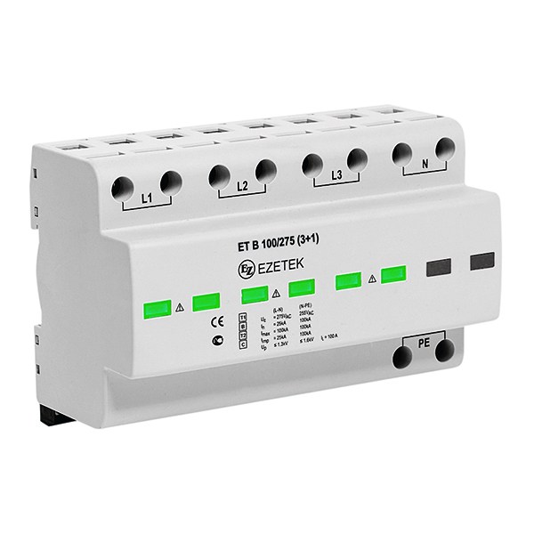 ET B 100 (3+1) — мощный трехфазный УЗИП I+II Класса комбинированного типа, выполненный на базе варисторов и газоразрядника (N – PE) для защиты оборудования в низковольтных цепях до 1000 В от прямых и отдаленных атмосферных разрядов при воздушном или кабельном вводах электропитания. Применяется в системах заземления: TN-S, TN-С-S, TT. УЗИП выдерживает токовые нагрузки соответствующие УЗИП Класса I, а по ограничению переходных напряжений — УЗИП Класса II. Устанавливаются в пределах 0А(В) — 1 зон молниезащиты (в соответствии с МЭК 62305 и CO-153-34. 21. 122-2003).