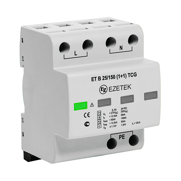 УЗИП ET B 25/150 (1+1) TCG – двухполюсное устройство защиты от импульсных перенапряжений класса испытаний I+II по ГОСТ IEC 61643-11, выполненное на базе варистора и газового разрядника. Устройство предназначено для установки в сетях с номинальным напряжением 120 В и максимальным длительным напряжением 150 В, способно выдерживать импульсные токи формы 10/350 мкс до 25 кА, формы 8/20 – до 50/100 кА (L-N/N-PE). Применяется в сетях с системами заземления типа TN-S, TT.