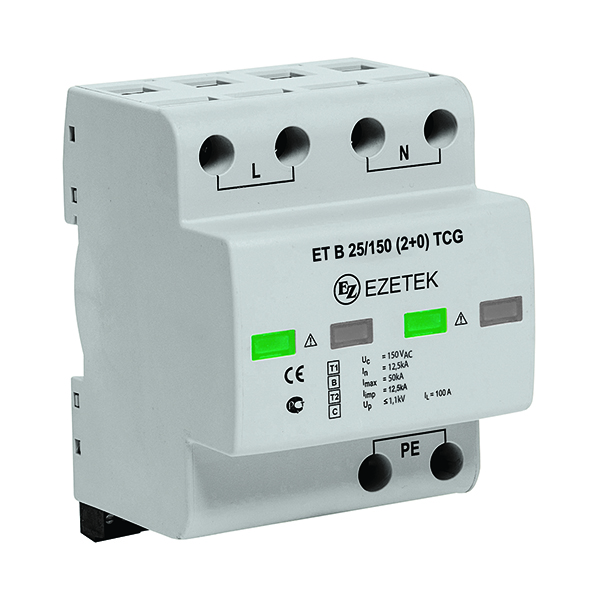 УЗИП ET B 25/150 TCG (2+0) – двухполюсное устройство защиты от импульсных перенапряжений класса испытаний I+II по ГОСТ IEC 61643-11, выполненное на базе варисторов. Устройство предназначено для установки в сетях с номинальным напряжением 120 В и максимальным длительным напряжением 150 В, способно выдерживать импульсные токи формы 10/350 мкс до 25 кА, формы 8/20 – до 50 кА. Применяется в сетях с системами заземления типа TN-S, TN-C, TT.