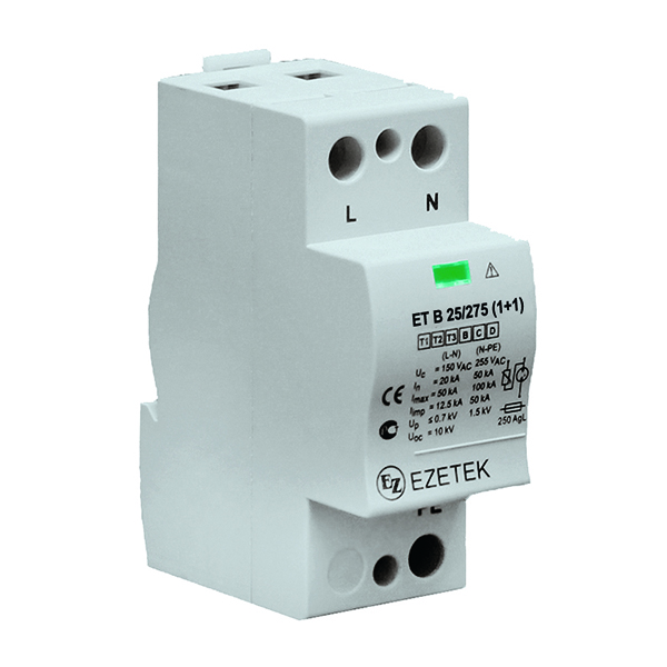 УЗИП ET B 25/275 (1+1) – двухполюсное устройство защиты от импульсных перенапряжений класса испытаний I+II по ГОСТ IEC 61643-11, выполненное на базе варистора и газового разрядника. Устройство предназначено для установки в сетях с номинальным напряжением 230 В и максимальным длительным напряжением 275 В, способно выдерживать импульсные токи формы 10/350 мкс до 25 кА, формы 8/20 – до 50/100 кА (L-N/N-PE). Применяется в сетях с системами заземления типа TN-S, TT.