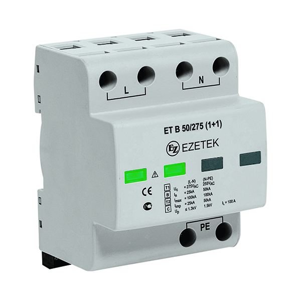 УЗИП ET B 50/150 (1+1) – двухполюсное устройство защиты от импульсных перенапряжений класса испытаний I+II по ГОСТ IEC 61643-11, выполненное на базе варисторов и газового разрядника. Устройство предназначено для установки в сетях с номинальным напряжением 120 В и максимальным длительным напряжением 150 В, способно выдерживать импульсные токи формы 10/350 мкс до 50 кА, формы 8/20 – до 100/100 кА (L-N/N-PE). Применяется в сетях с системами заземления типа TN-S, TT.
