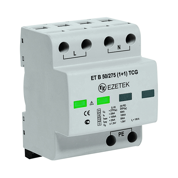 УЗИП ET B 50/275 (1+1) TCG – двухполюсное устройство защиты от импульсных перенапряжений класса испытаний I+II по ГОСТ IEC 61643-11, выполненное на базе варисторов и газового разрядника. Устройство предназначено для установки в сетях с номинальным напряжением 230 В и максимальным длительным напряжением 275 В, способно выдерживать импульсные токи формы 10/350 мкс до 50 кА, формы 8/20 – до 50/100 кА (L-N/N-PE). Применяется в сетях с системами заземления типа TN-S, TT.