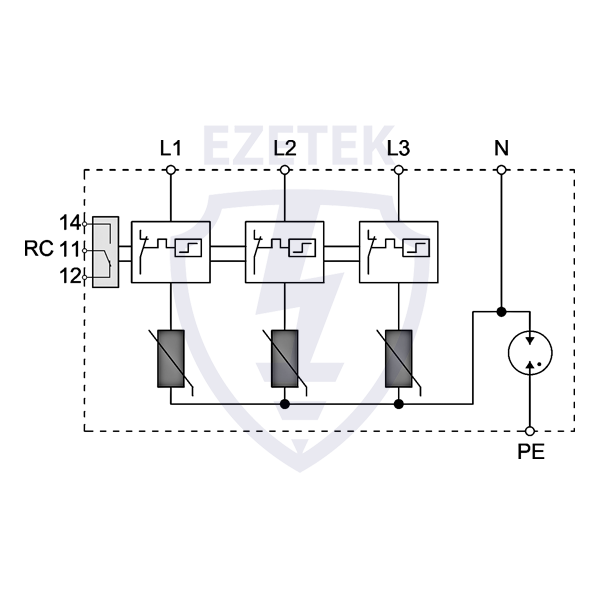 ET B 50 (3+1) — мощный трехфазный УЗИП I+II Класса комбинированного типа, выполненный на базе варисторов и газоразрядника (N – PE) для защиты оборудования в низковольтных цепях до 1000 В от прямых и отдаленных атмосферных разрядов при воздушном или кабельном вводах электропитания. Применяется в системах заземления: TN-S, TN-С-S, TT. УЗИП выдерживает токовые нагрузки соответствующие УЗИП Класса I, а по ограничению переходных напряжений — УЗИП Класса II. Устанавливаются в пределах 0А(В) — 1 зон молниезащиты (в соответствии с МЭК 62305 и CO-153-34. 21. 122-2003).