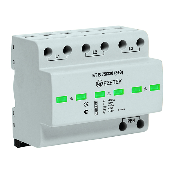 УЗИП ET B 75/320 (3+0) – трехполюсное устройство защиты от импульсных перенапряжений класса испытаний I+II по ГОСТ IEC 61643-11, выполненное на базе варисторов. Устройство предназначено для установки в сетях с номинальным напряжением 230 В и максимальным длительным напряжением 320 В, способно выдерживать импульсные токи формы 10/350 мкс до 75 кА, формы 8/20 – до 100 кА. Применяется в сетях с системами заземления типа TN-C.