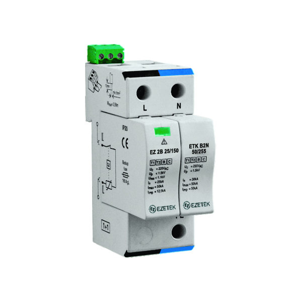 УЗИП EZ 2B 25/150 (1+1) – двухполюсное устройство защиты от импульсных перенапряжений класса испытаний I+II по ГОСТ IEC 61643-11, выполненное на базе варистора и газового разрядника. Устройство предназначено для установки в сетях с номинальным напряжением 120 В и максимальным длительным напряжением 150 В, способно выдерживать импульсные токи формы 10/350 мкс до 25 кА, формы 8/20 – до 60/50 кА (L-N/N-PE). Применяется в сетях с системами заземления типа TN-S, TT.