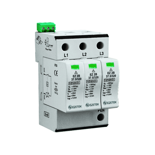 УЗИП EZ 2B 37,5/320 (3+0) – трехполюсное устройство защиты от импульсных перенапряжений класса испытаний I+II по ГОСТ IEC 61643-11, выполненное на базе варисторов. Устройство предназначено для установки в сетях с номинальным напряжением 230 В и максимальным длительным напряжением 320 В, способно выдерживать импульсные токи формы 10/350 мкс до 37,5 кА, формы 8/20 – до 60 кА. Применяется в сетях с системами заземления типа TN-C.