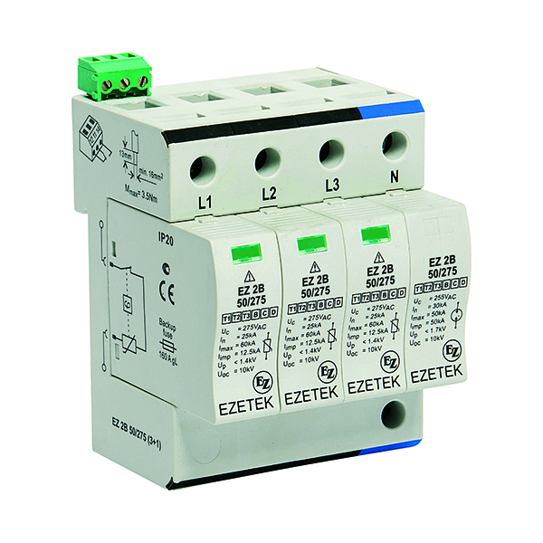 УЗИП EZ 2B 50/275 (3+1) – четырёхполюсное устройство защиты от импульсных перенапряжений класса испытаний I+II по ГОСТ IEC 61643-11, выполненное на базе варисторов и газового разрядника. Устройство предназначено для установки в сетях с номинальным напряжением 230 В и максимальным длительным напряжением 275 В, способно выдерживать импульсные токи формы 10/350 мкс до 50 кА, формы 8/20 – до 60/50 кА (L-N/N-PE). Применяется в сетях с системами заземления типа TN-S, TT.