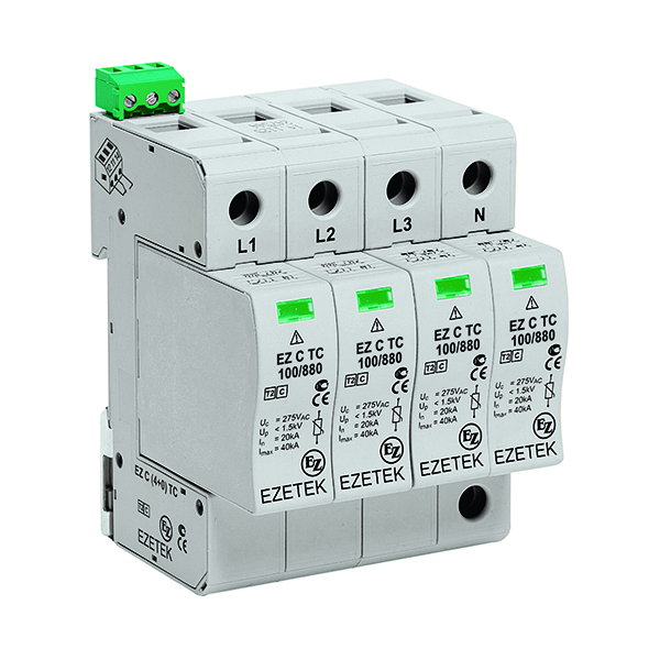 УЗИП EZ C 100/880 (4+0) ТС – четырёхполюсное устройство защиты от импульсных перенапряжений класса испытаний II по ГОСТ IEC 61643-11, выполненное на базе варисторов. Устройство предназначено для установки в сетях с номинальным напряжением 400 В и максимальным длительным напряжением 880 В, способно выдерживать импульсные токи формы 8/20 мкс до 40 кА. Благодаря наличию индивидуальных модулей контроля перегрева значительно увеличивается срок службы варисторов. Применяется в сетях с системами заземления типа TN-S, TN-C-S.