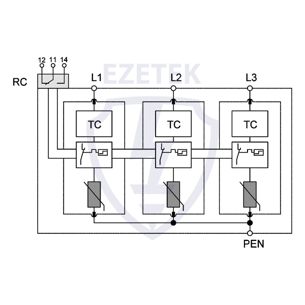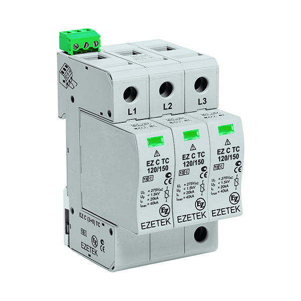 УЗИП EZ C 120/150 (3+0) ТС – трёхполюсное устройство защиты от импульсных перенапряжений класса испытаний II по ГОСТ IEC 61643-11, выполненное на базе варисторов. Устройство предназначено для установки в сетях с номинальным напряжением 120 В и максимальным длительным напряжением 150 В, способно выдерживать импульсные токи формы 8/20 мкс до 40 кА. Благодаря наличию индивидуальных модулей контроля перегрева значительно увеличивается срок службы варисторов. Применяется в сетях с системами заземления типа TN-C.