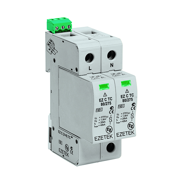 УЗИП EZ C 80/275 (2+0) TC – двухполюсное устройство защиты от импульсных перенапряжений класса испытаний II по ГОСТ IEC 61643-11, выполненное на базе варисторов. Устройство предназначено для установки в сетях с номинальным напряжением 220 В и максимальным длительным напряжением 275 В, способно выдерживать импульсные токи формы 8/20 мкс до 40 кА. Благодаря наличию индивидуальных модулей контроля перегрева значительно увеличивается срок службы варистора. Применяется в сетях с системами заземления типа TN-S, TN-С-S, TT и IT.
