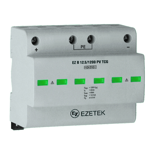 EZ B 12,5 PV TCG — мощный однополюсный УЗИП I+II класса ограничивающего типа, выполненный на базе варисторов для защиты фотоэлектрических систем от прямых и отдаленных атмосферных разрядов. Благодаря новой конструкции TCG УЗИП невосприимчив к временному перенапряжению, полностью исключена утечка тока на землю, рассчитан на более длительный срок службы. УЗИП применяется в цепях постоянного тока и выдерживает токовые нагрузки соответствующие УЗИП класса I, а по ограничению переходных напряжений — УЗИП класса II. Устанавливаются в пределах 0А(В) - 1 зон молниезащиты (в соответствии с МЭК 62305 и CO-153-34. 21. 122-2003).
