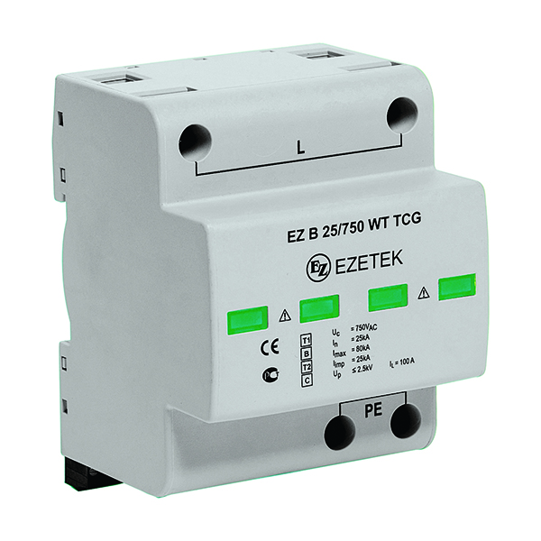EZ B 25 WT TCG — мощный однополюсный УЗИП I+II класса ограничивающего типа, выполненный на базе варисторов для защиты ветрогенераторных систем от прямых и отдаленных атмосферных разрядов. Благодаря новой конструкции TCG УЗИП невосприимчив к временному перенапряжению, полностью исключена утечка тока на землю, рассчитан на более длительный срок службы. Применяется в системах заземления: TN-С , TN-S, TN-С-S, TT и IT. УЗИП выдерживает токовые нагрузки соответствующие УЗИП класса I, а по ограничению переходных напряжений — УЗИП класса II. Устанавливаются в пределах 0А(В) - 1 зон молниезащиты (в соответствии с МЭК 62305 и CO-153-34. 21. 122-2003).