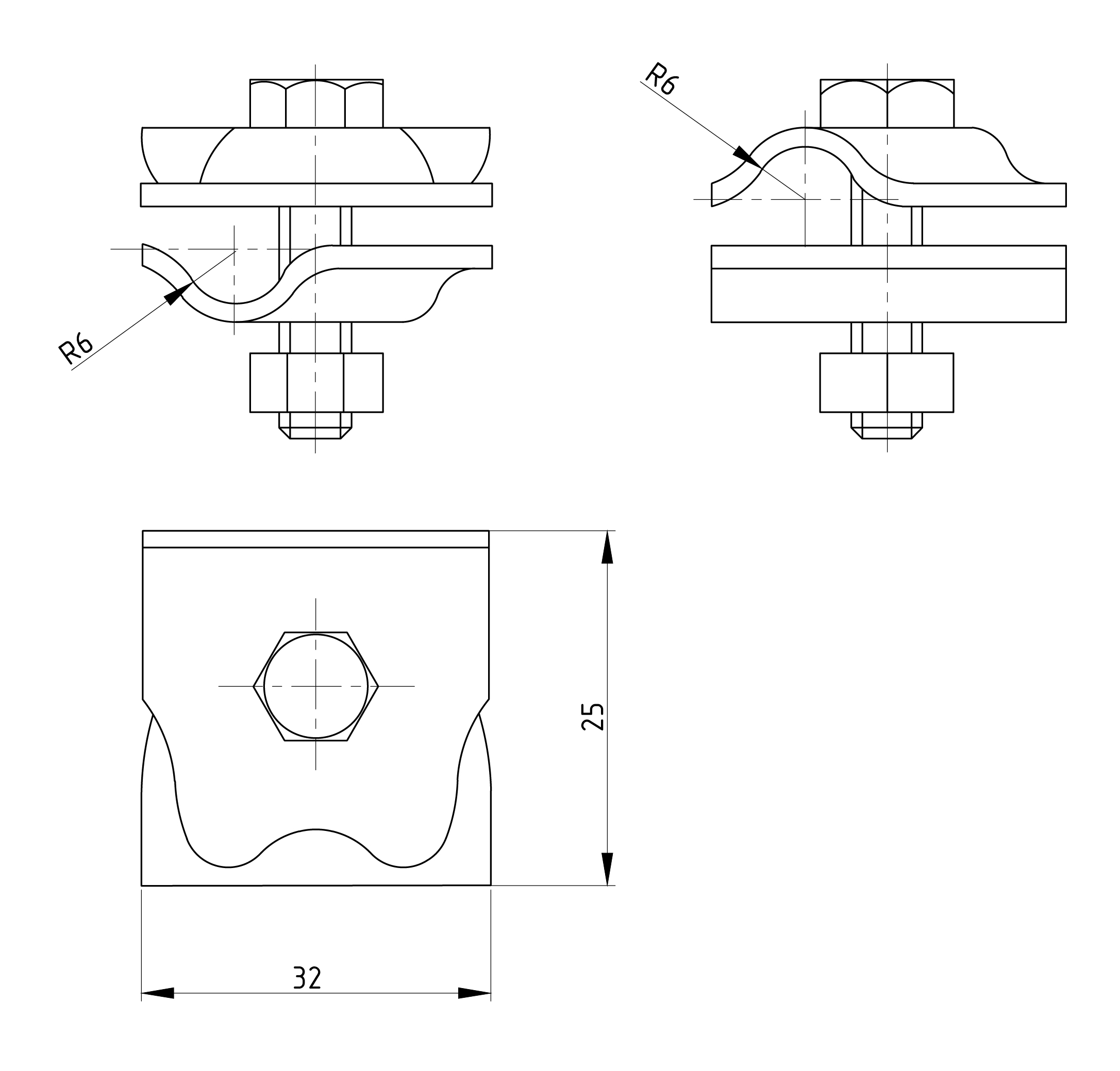 Зажим позволяет соединять пруток молниезащитной сетки и токоотводов диаметром 6-8 мм в перпендикулярном направлении, в параллельном направлении, а также под произвольным углом.