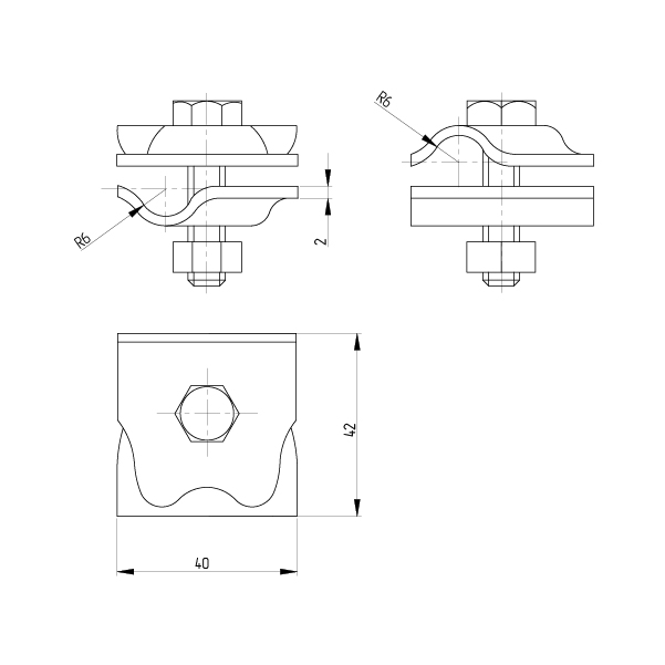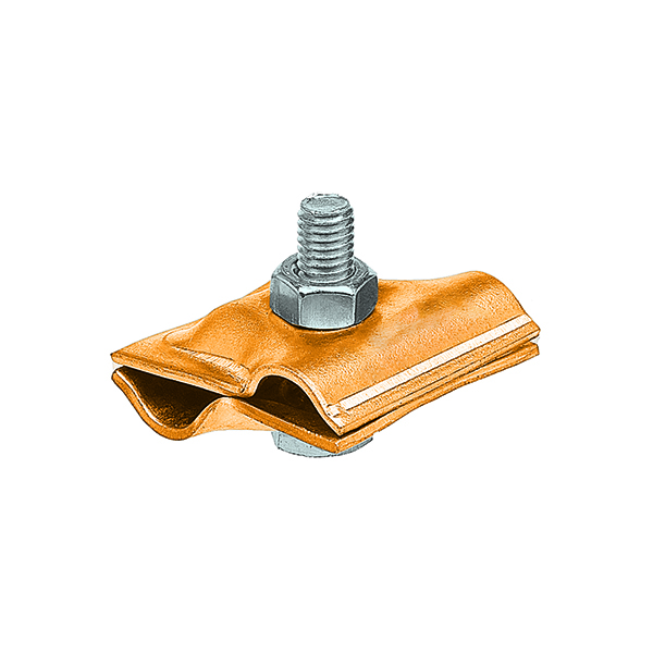 Зажим позволяет соединять пруток молниезащитной сетки и токоотводов диаметром 8-10 мм в перпендикулярном направлении, в параллельном направлении, а также под произвольным углом.