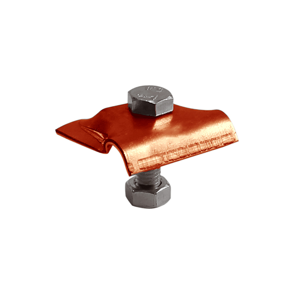 Зажим выполнен из меди и используется для фиксации прутка системы молниезащиты диаметром 8-10 мм непосредственно к фасаду здания или к металлическим конструкциям при помощи винта.
