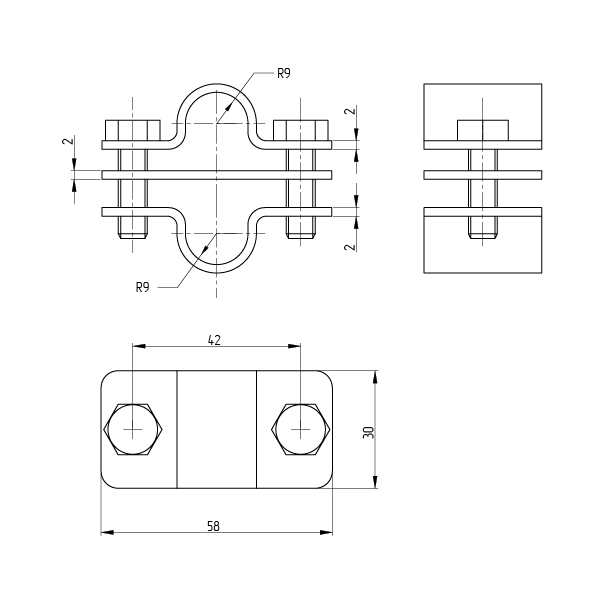 Зажим позволяет выполнить соединение в параллельном направлении стрежней, молниеприемников диаметром 16 мм между собой. Зажим стягивается болтами М8.